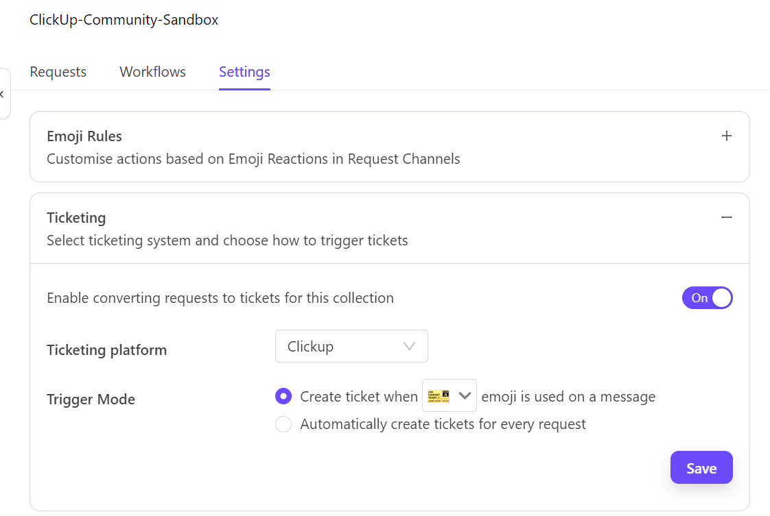 * If it is an emoji-based creation, choose the emoji that should trigger ticket creation (default is :ticket: emoji).