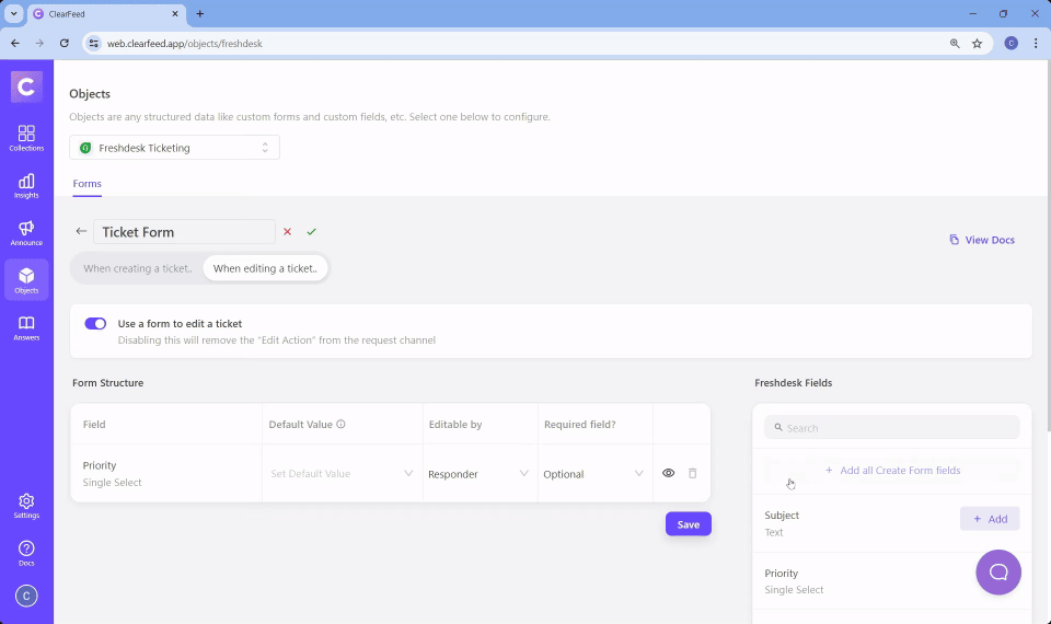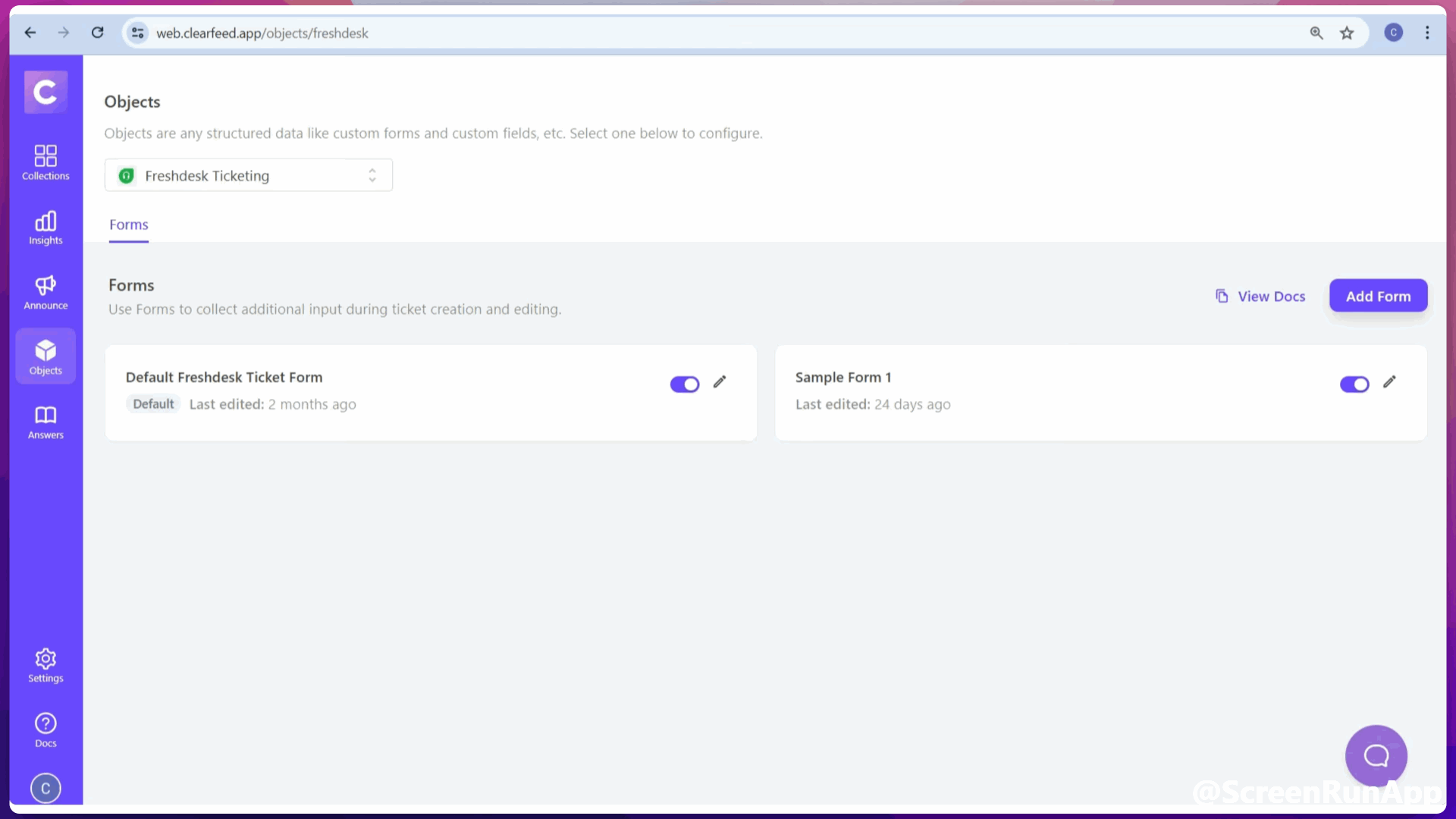 * Navigate to [Forms](https://web.clearfeed.app/objects/freshdesk) on the ClearFeed web console, toggle Freshdesk Ticketing under Objects, and click on **Add Form.**