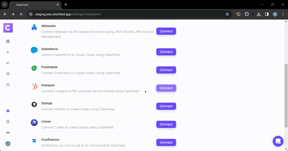 1. Head over to the integrations page -> <https://web.clearfeed.app/settings/integrations>.