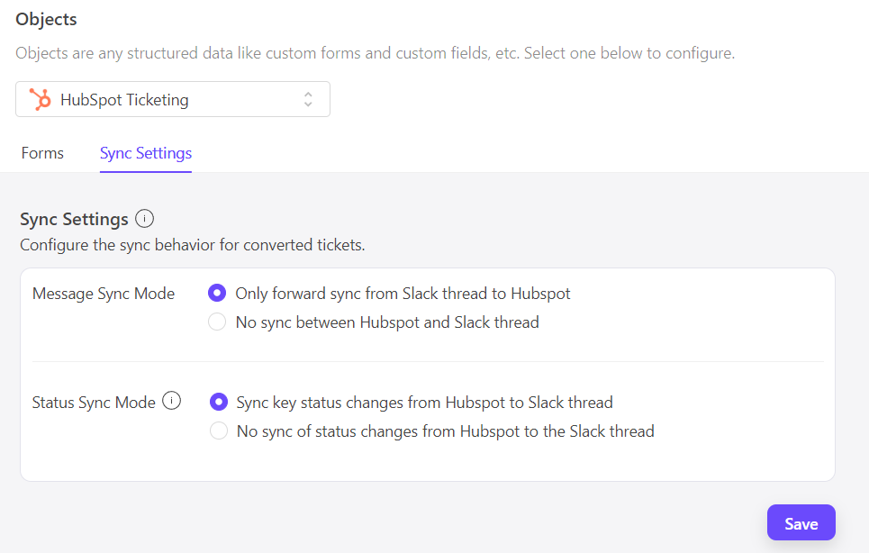Sync settings allow you to choose whether messages are synced bidirectionally or in a single direction. Additionally, you can decide if updates to the linked ticket's status are shared in the Slack thread.