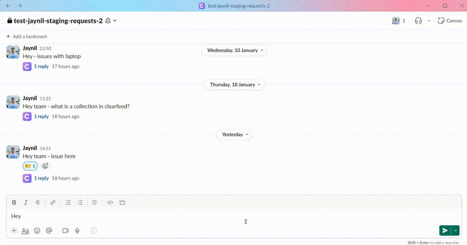 * If you want to customize the title of the alert message shared with requesters in the request channel, please reach out to our Support team via Slack or email us at <support@clearfeed.ai>