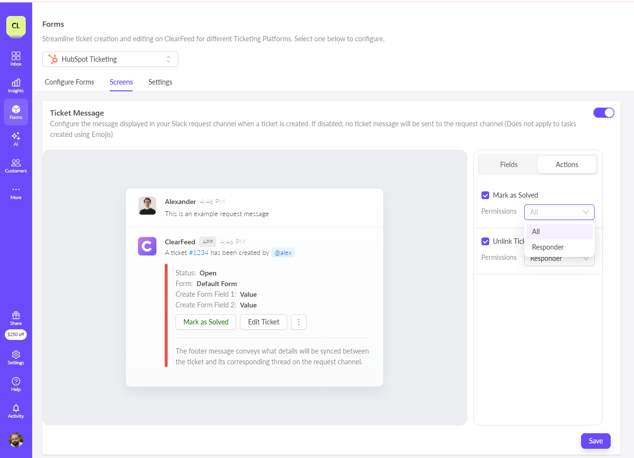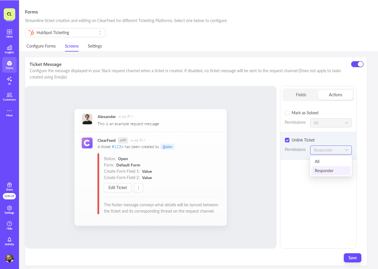 ClearFeed has a robust integration with HubSpot that allows agents and responders to create HubSpot tickets from Slack. Currently, HubSpot ticket creation is supported only from Slack channels and is not available in Microsoft Teams.