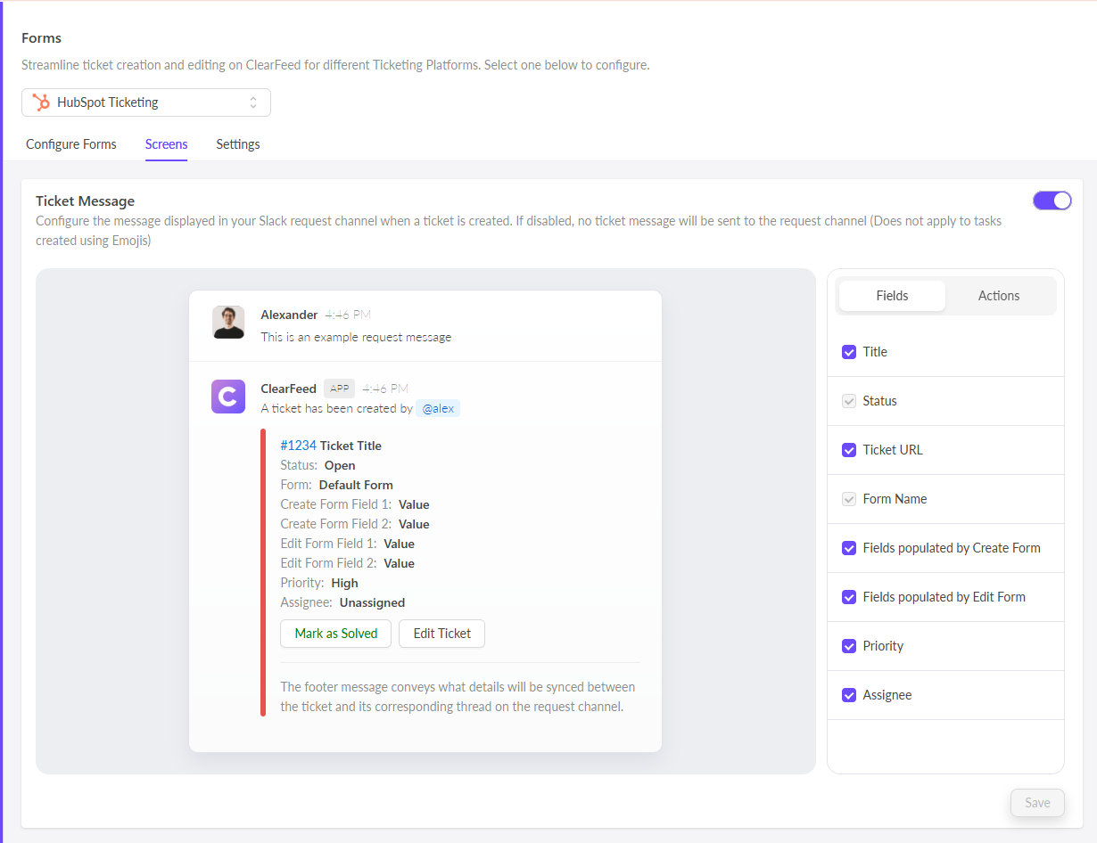 * The screens section lets you completely disable the ticket message by toggling off Screens. This would mean that whenever a HubSpot ticket is created, users will not see any confirmation message and ticket details.