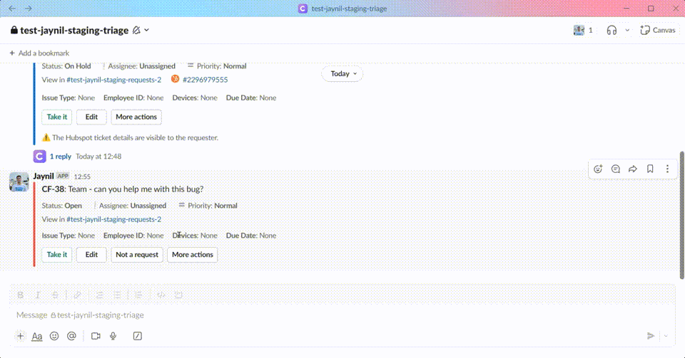 * The corresponding request channel thread on Slack now displays the Title, ID, URL, and Status of the HubSpot ticket.