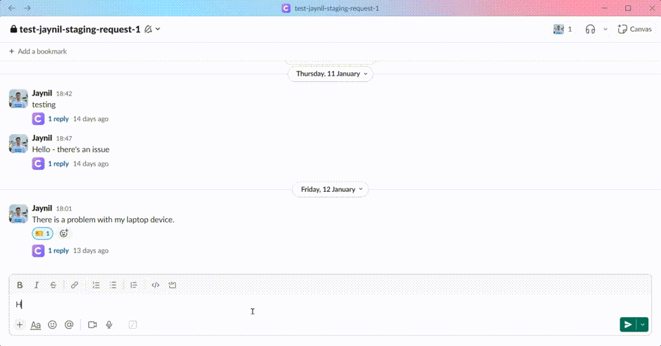 1. Every new conversation (Slack thread) that is initiated on the request channel gets converted into a HubSpot ticket automatically.