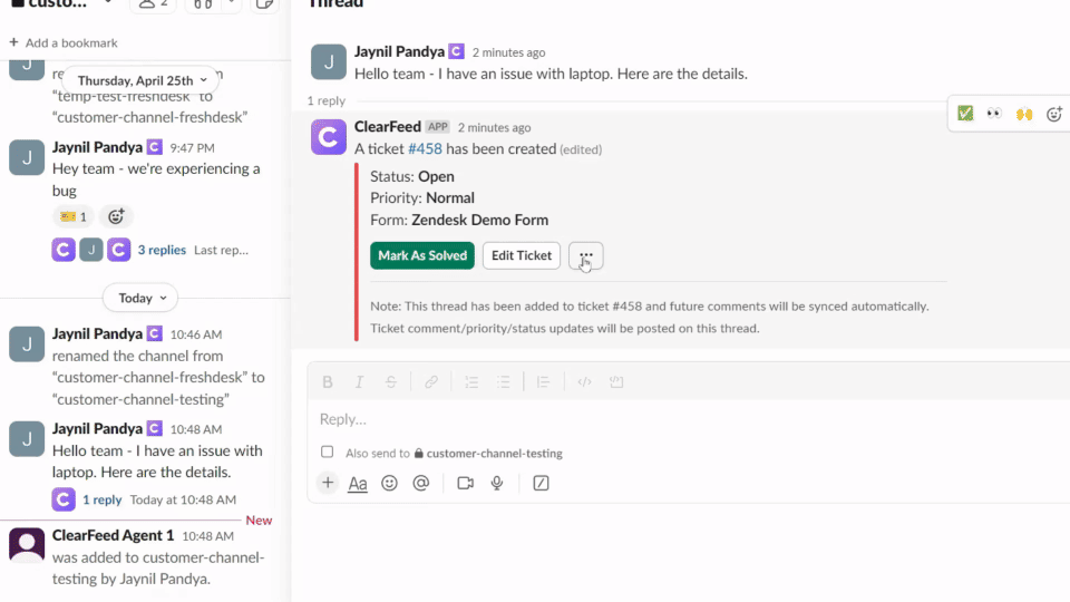 2. As soon as the ticket conversation occurs, ClearFeed posts a message on the Slack thread sharing the HubSpot ticket details.