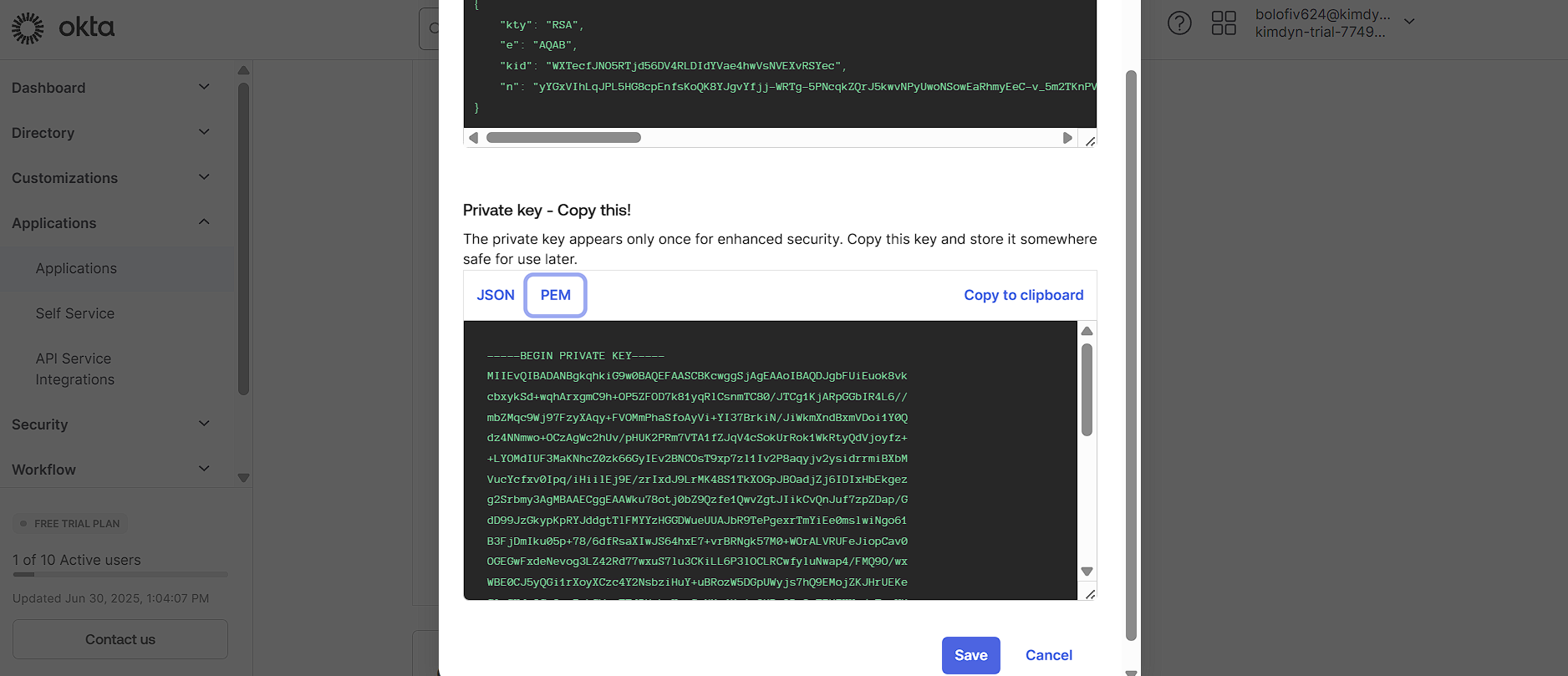 * This **Private Key**, along with **Client ID** and **Key ID (KID)** from the General Tab, should be entered on the Connection to Okta in ClearFeed.