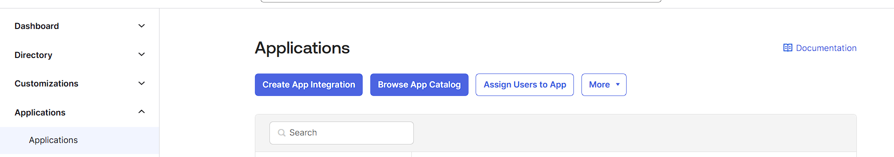 * In the **Admin Console**, go to `Applications > Applications`, and then click **Create App Integration**. The Create a new app integration page appears.