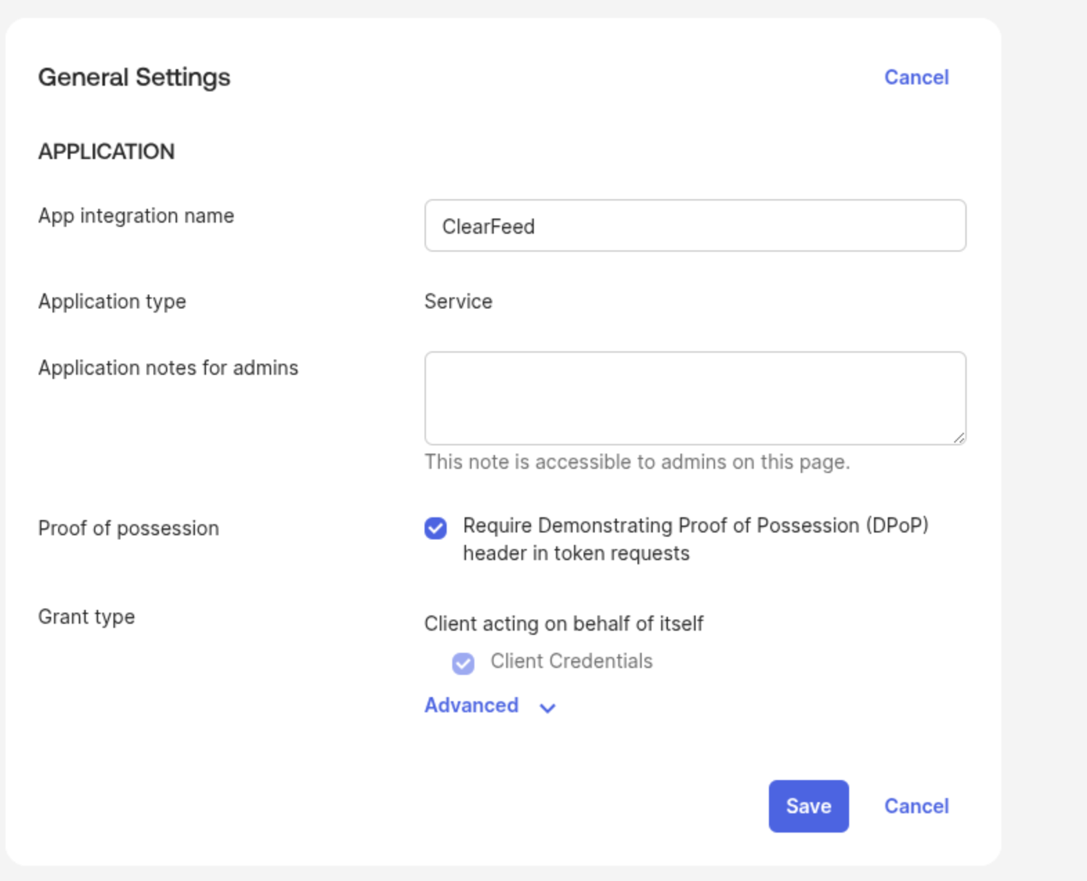 * It is recommended to create a new custom role with permissions to manage users, groups, applications, and Identity Access Management. The specific permissions you assign should depend on how you intend to use Okta with ClearFeed. Alternatively, you can use an existing role such as the Organization Administrator role if it already provides the necessary permissions. Once the role is created or selected, assign it to the service app and click **Save Changes** when you finish. You may be prompted to authenticate.