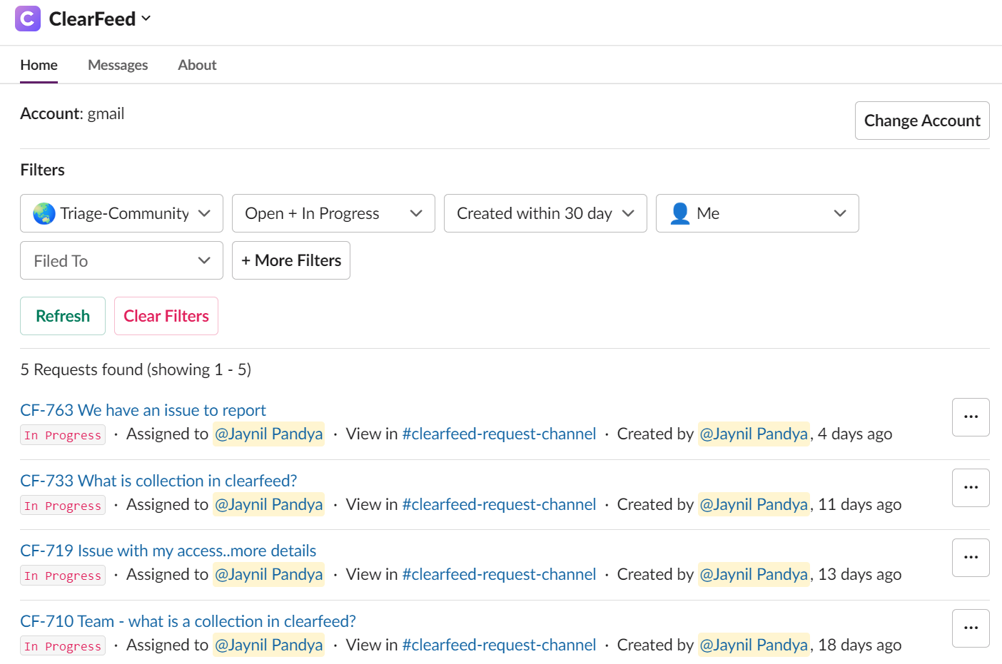 <figure><img src="https://3455705434-files.gitbook.io/~/files/v0/b/gitbook-x-prod.appspot.com/o/spaces%2FE2O2wTaNovd6fXpEuLKz%2Fuploads%2Fgit-blob-7c2809d901862d44a3eacf1a162d16399fa64d76%2Fimage%20(114).png?alt=media" alt="" width="563"><figcaption><p>ClearFeed App Home used for filtering requests</p></figcaption></figure>