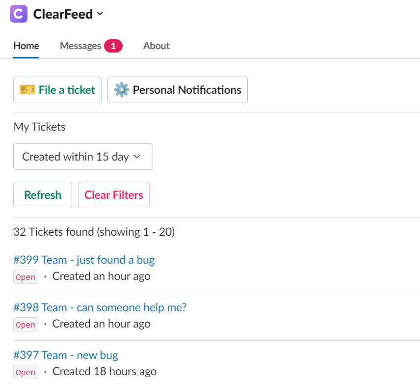 <figure><img src="https://3455705434-files.gitbook.io/~/files/v0/b/gitbook-x-prod.appspot.com/o/spaces%2FE2O2wTaNovd6fXpEuLKz%2Fuploads%2Fgit-blob-80781de2cbf2943fee2b61063b4342695ace53d3%2Fimage%20(152).png?alt=media" alt="" width="563"><figcaption><p>My Tickets view on the ClearFeed App for Slack</p></figcaption></figure>